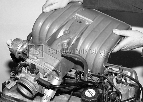 Fig. 20-3.  Shown during assembly, this H.O. upper intake section still has its EGR spacer, throttle body, throttle position sensor, and EGR valve attached.  Note the two center attaching bolt bosses normally hidden under the top cover plate.